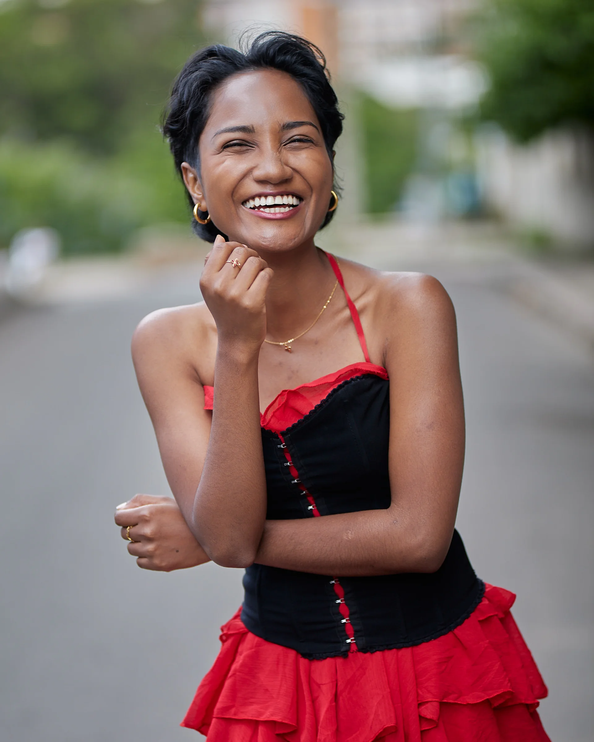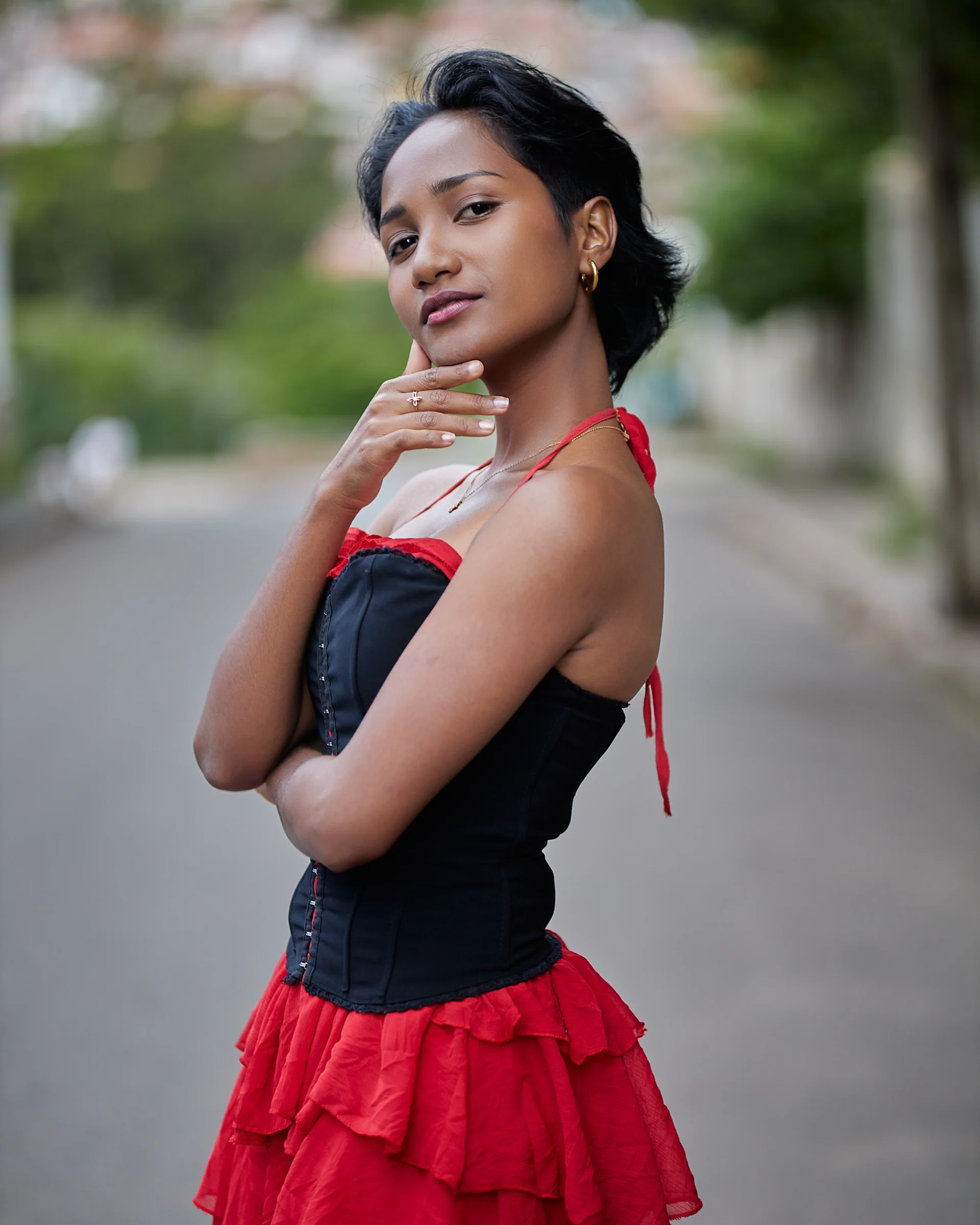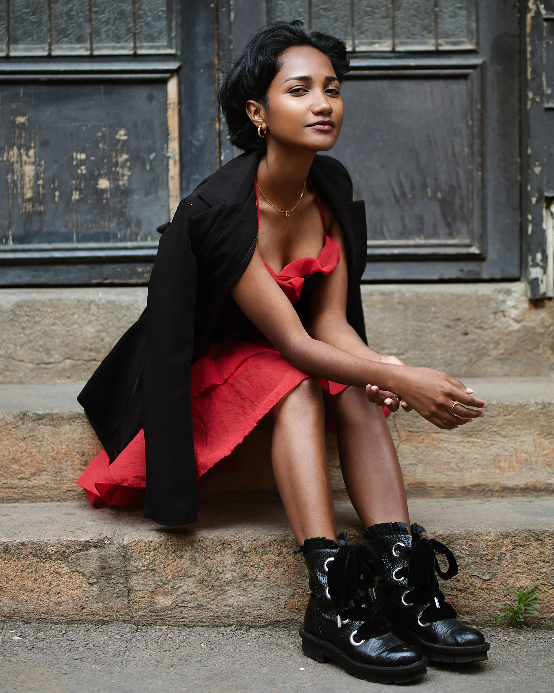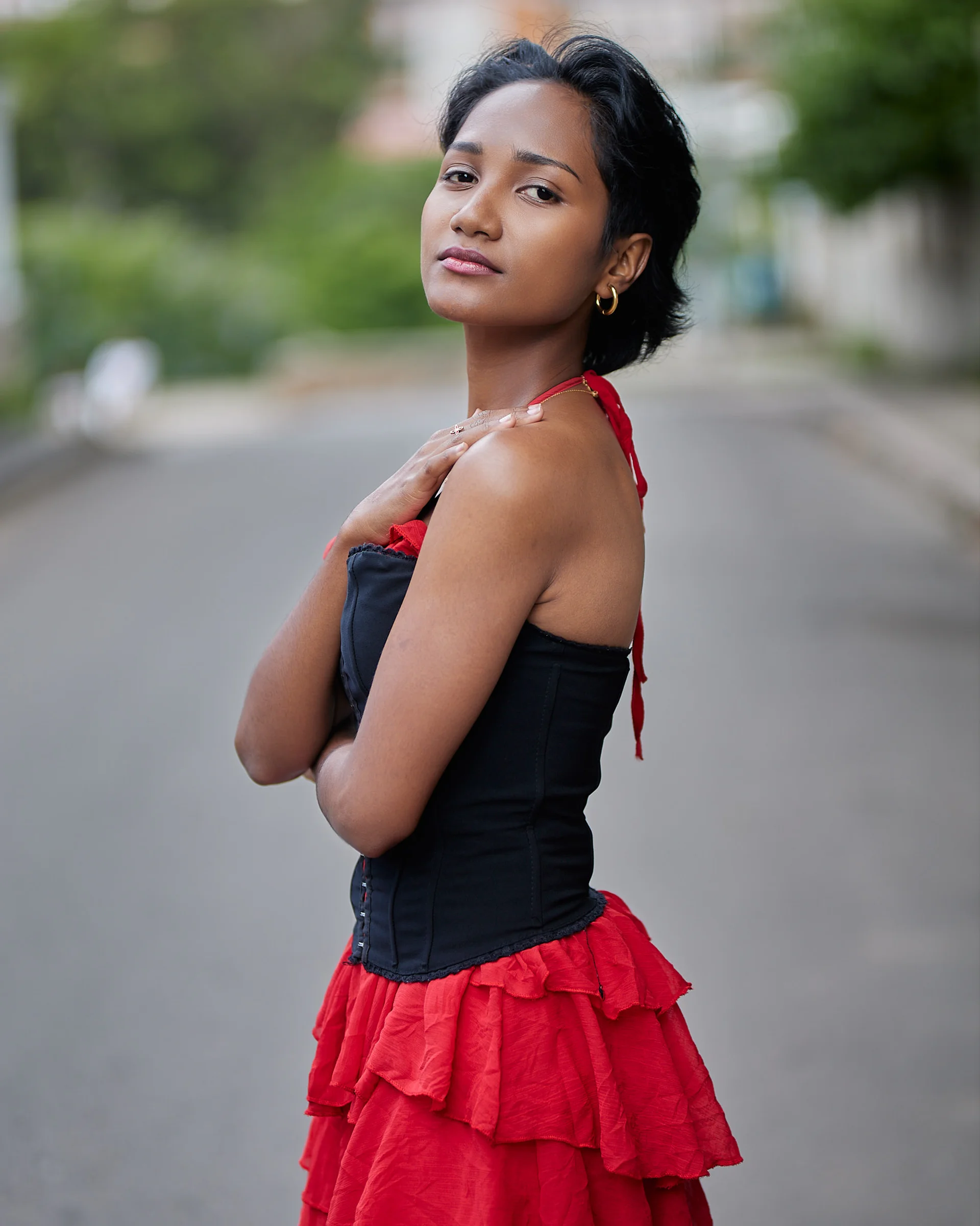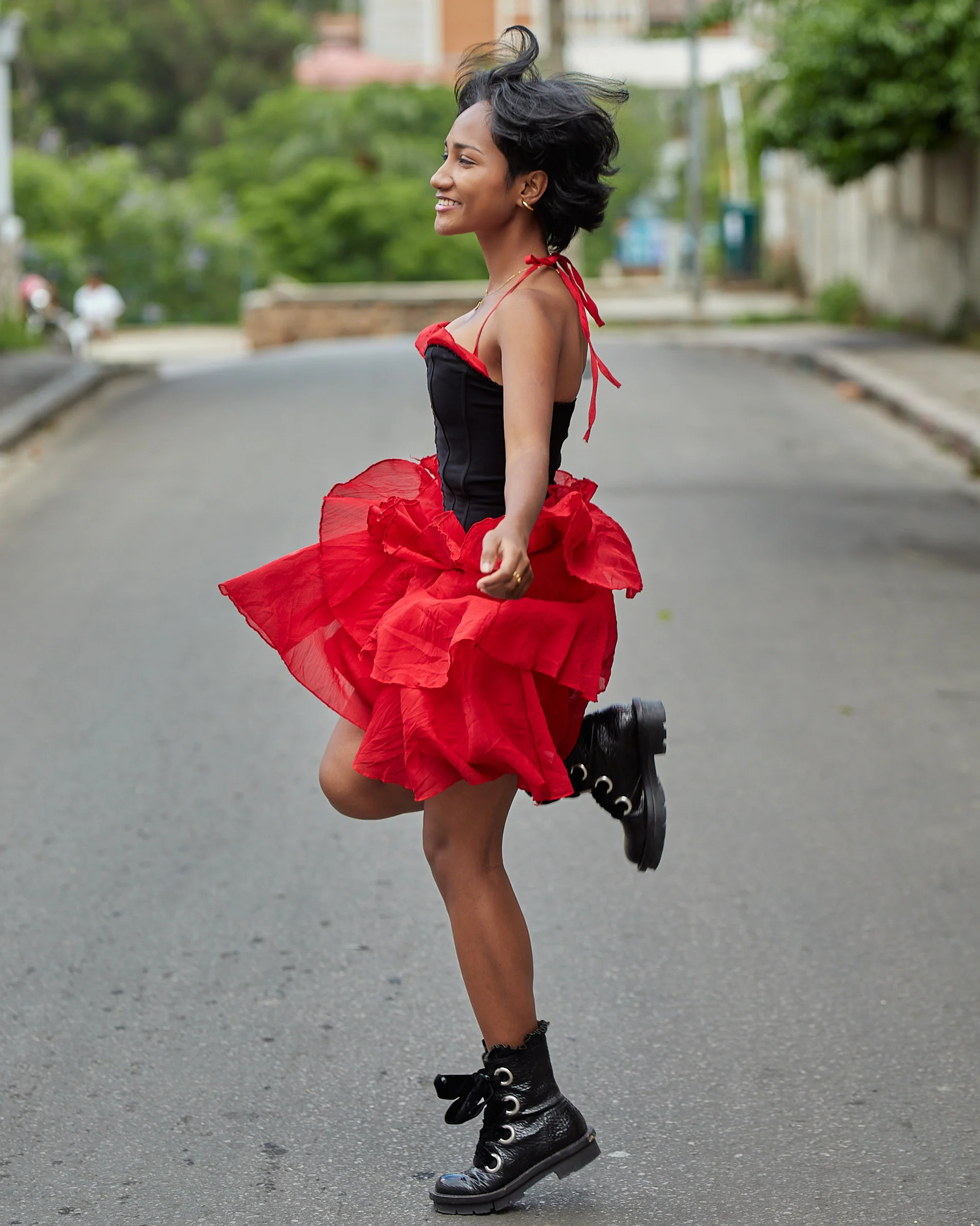 Christelle apporte une énergie audacieuse et romantique dans les rues d’Isoraka lors de cette séance mode, mêlant robe rouge volantée et corset noir à un manteau structuré et des bottes imposantes pour créer une vibe flamenco urbaine et moderne. L’alternance entre clichés en mouvement et portraits plus calmes met en valeur à la fois sa personnalité joueuse et sa présence forte et assurée dans ce décor citadin