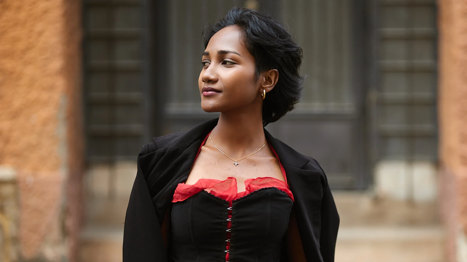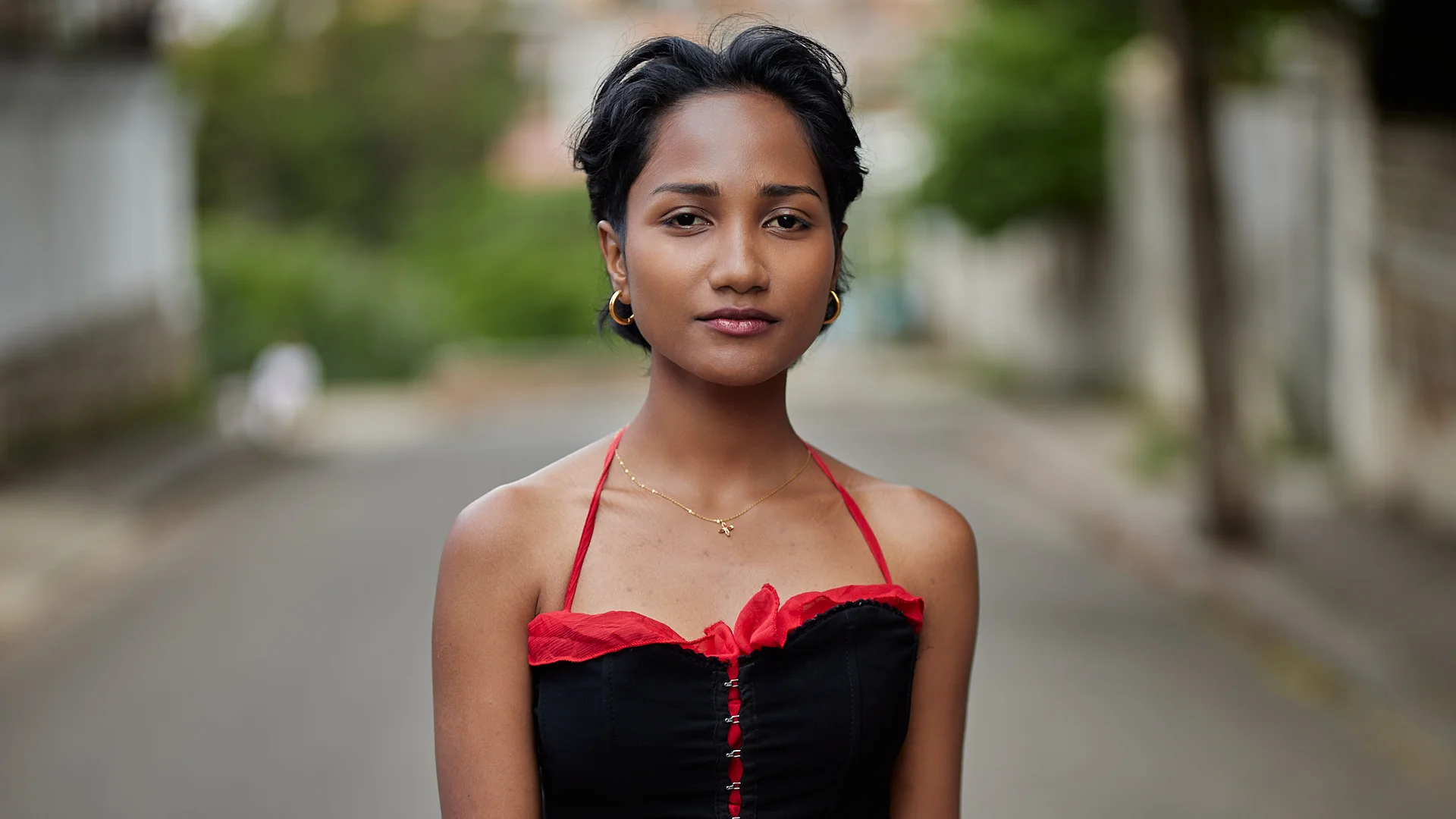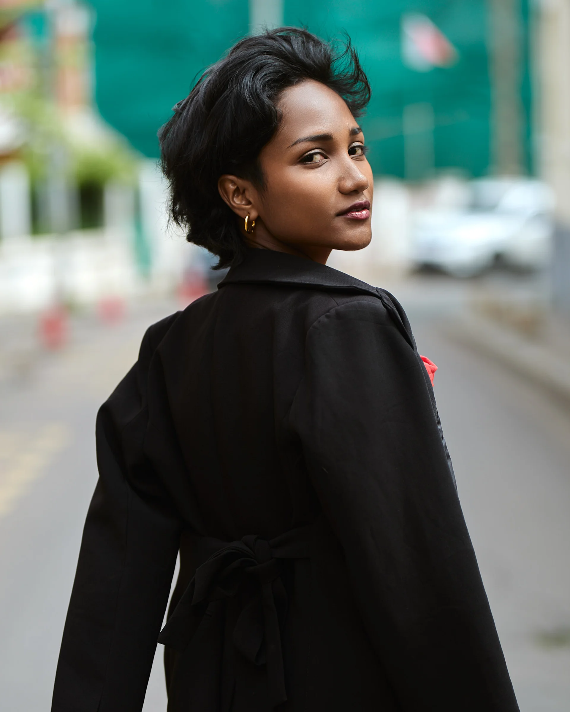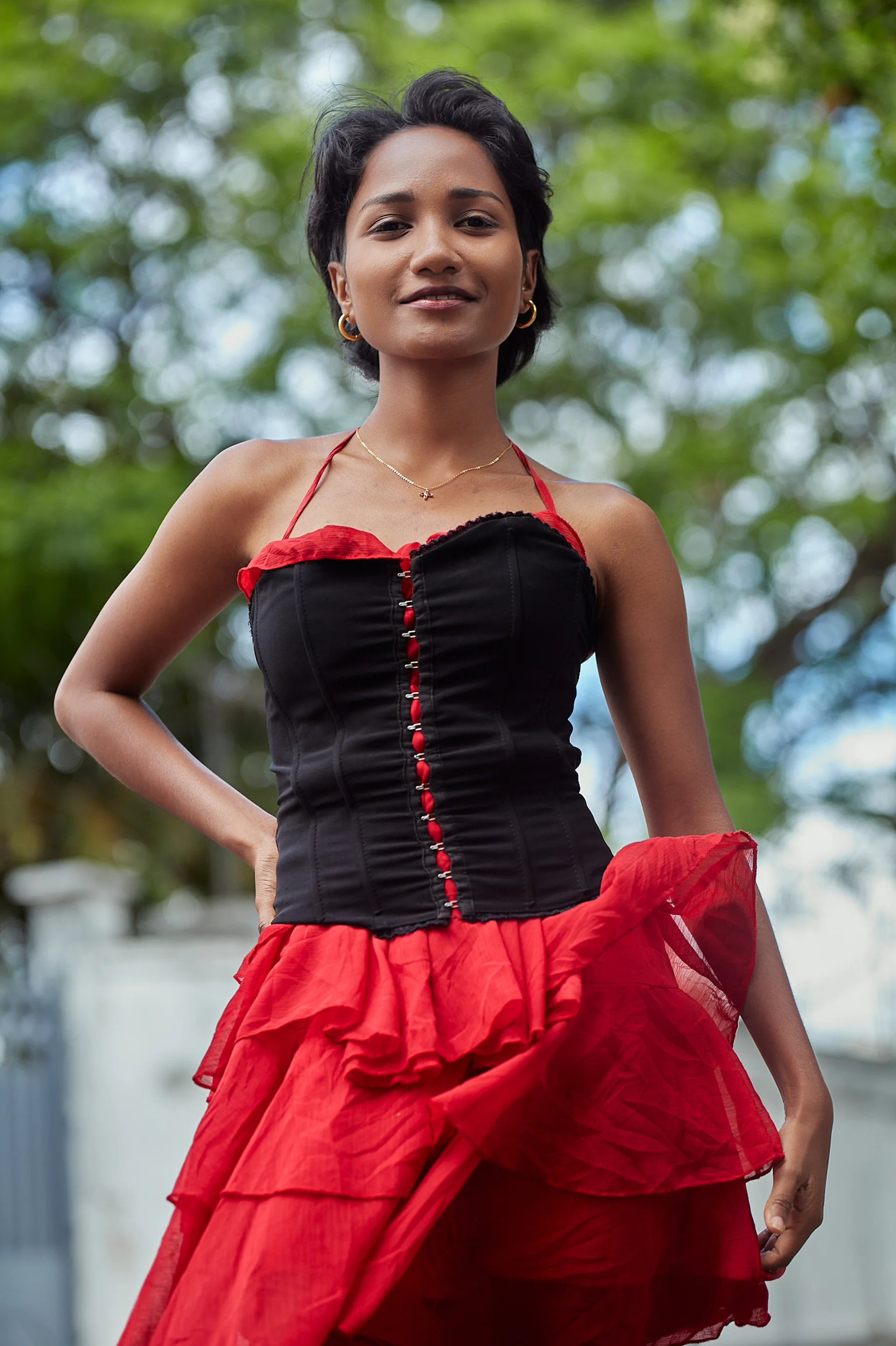 Christelle apporte une énergie audacieuse et romantique dans les rues d’Isoraka lors de cette séance mode, mêlant robe rouge volantée et corset noir à un manteau structuré et des bottes imposantes pour créer une vibe flamenco urbaine et moderne. L’alternance entre clichés en mouvement et portraits plus calmes met en valeur à la fois sa personnalité joueuse et sa présence forte et assurée dans ce décor citadin